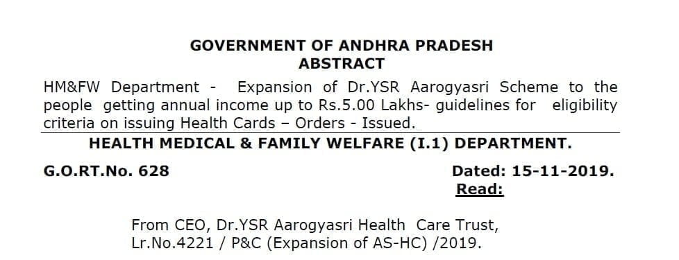 HM&FW Department – Expansion of Dr.YSR Aarogyasri Scheme to the people getting annual income up to Rs.5.00 Lakhs- guidelines for eligibility criteria on issuing Health Cards – Orders – Issued.