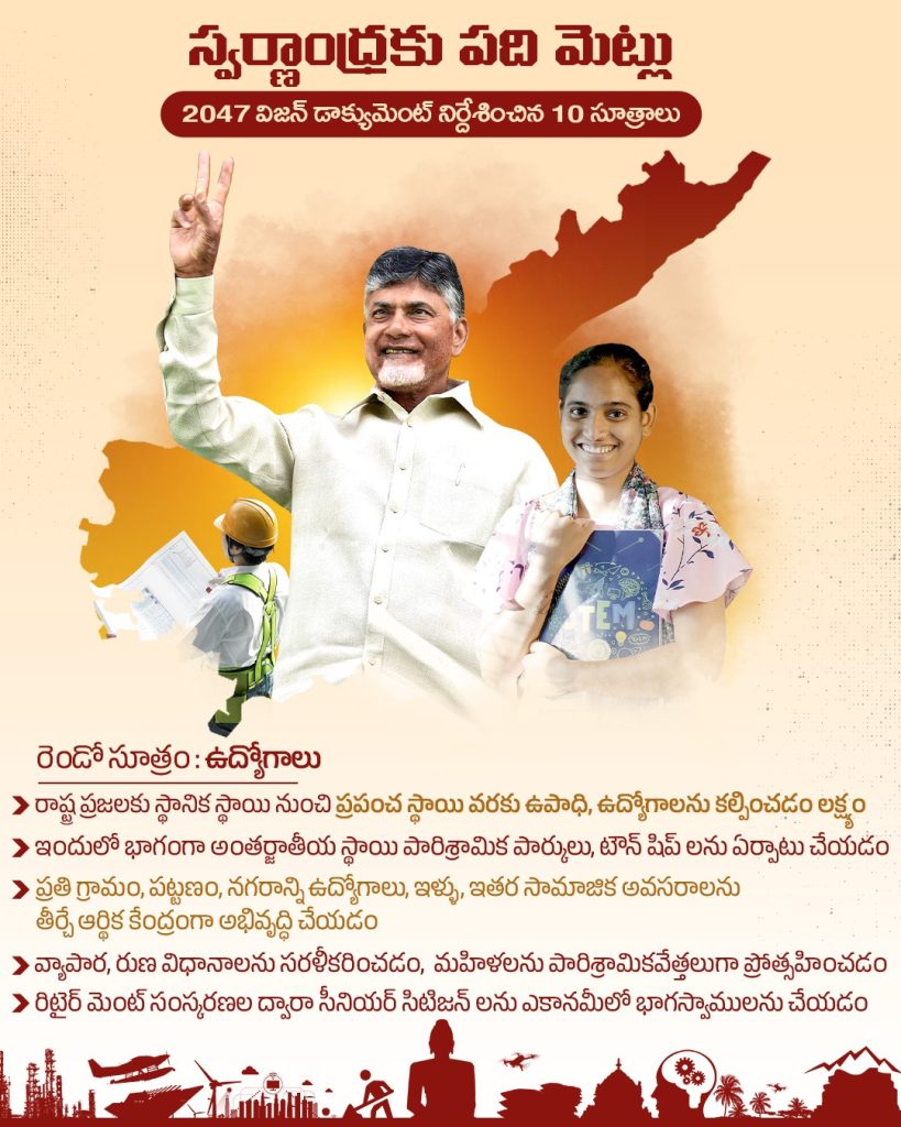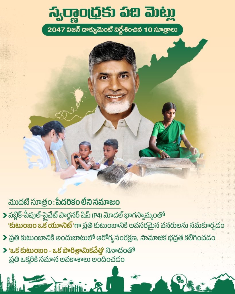 The government seeks active collaboration with private enterprises, citizens, and global organizations. Drawing inspiration from the Viksit Bharat initiative and best practices worldwide, Swarnandhra Vision aims to position Andhra Pradesh as a model state in sustainable development.