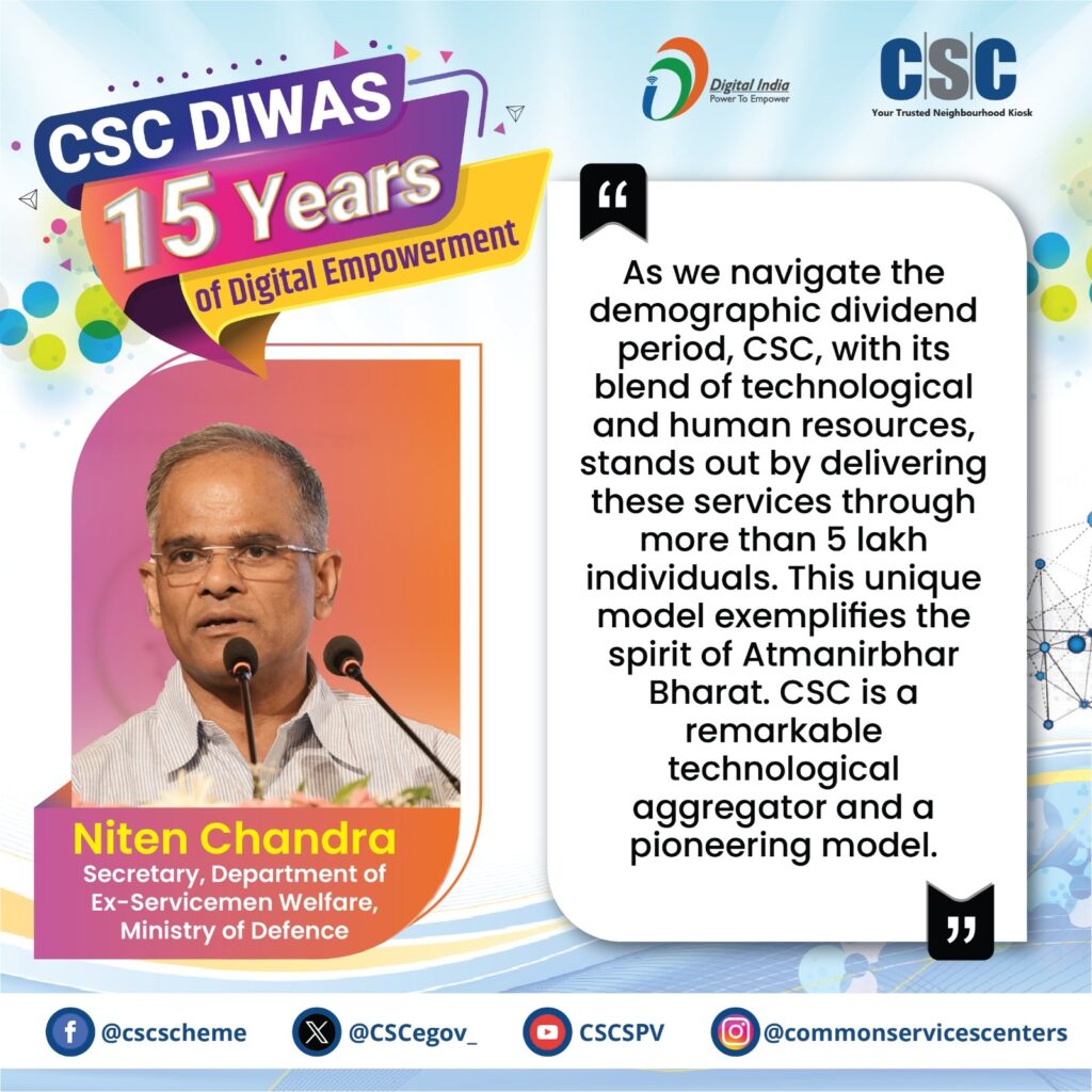 Niten Chandra, Secretary of the Department of Ex-Servicemen Welfare, Ministry of Defence, underscores the importance of CSC in the context of national development. He emphasizes that the unique model of CSC, blending technological advancements with human resources, is a prime example of the Atmanirbhar Bharat initiative. His vision includes expanding the reach of CSC to ensure that every citizen, regardless of their location, can benefit from the services provided.