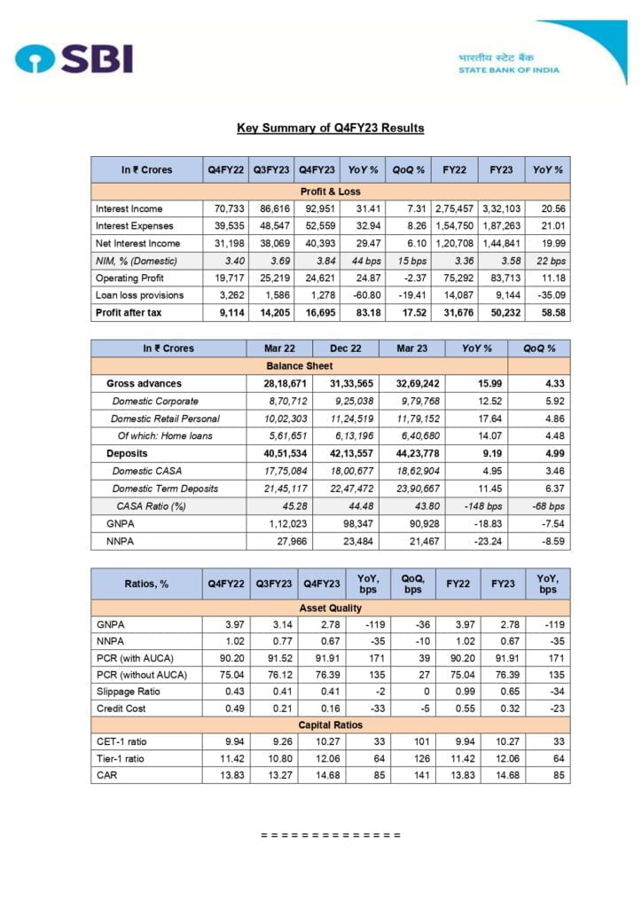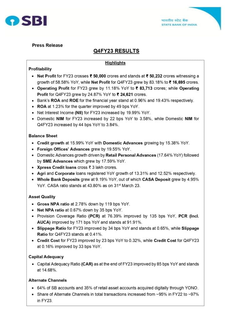 The State Bank of India (SBI) recently announced its SBI Q4 Results 2023 for the fiscal year, and the numbers have surpassed expectations. The net profit for the quarter soared by a remarkable 83% year-on-year (YoY) to reach a staggering Rs 16,695 crore, leaving investors and analysts pleasantly surprised. This significant boost in profits showcases the bank’s resilience and ability to adapt to the challenging economic conditions. Let’s dive deeper into the details of SBI’s impressive performance and the factors contributing to its success.