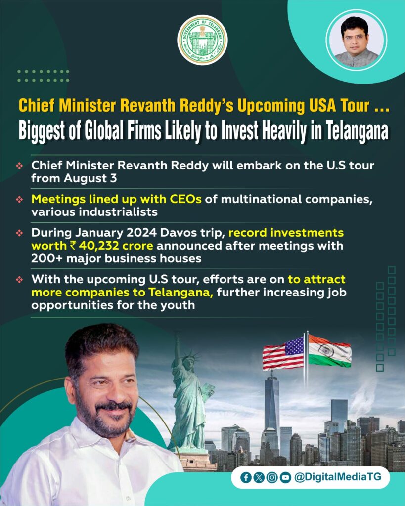 CM Revanth Reddy, along with IT Minister Sridhar Babu and senior officials, will meet with CEOs and leadership teams of multinational corporations, extending invitations to invest in Telangana. The tour is expected to result in significant announcements regarding new investments and the signing of memoranda of understanding (MoUs).