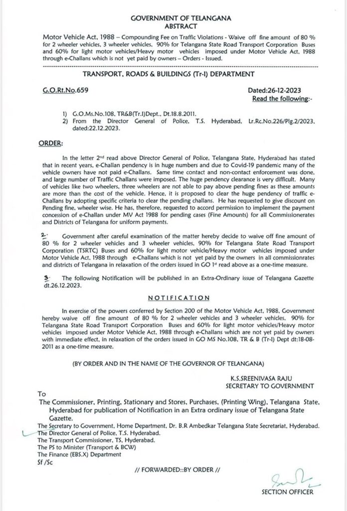 Director General of Police. Telangana State. Hyderabad has stated that in recent years. e-Challan pendency is in huge numbers and due to the Covid-19 pandemic, many vehicle owners have not paid e-Challans. Same-time contact and non-contact enforcement were done. and la, a number of Traffic Challans were imposed. The huge pendency clearance is tough. May of vehicles like two-wheelers. three-wheelers are not able to pay the above pending fines as these amounts are more than the cost of the vehicle. Hence. it is proposed to clear the huge pendency of traffic e-Challans by adopting specific criteria to clear the pending challans. He has requested to give a discount on the Pending fine. wheeler wise. He has. therefore. requested to accord permission to implement the payment concession of e-Challan under MV Ad 1988 for pending cases (Fine Arnounts) for all Commissionerates and Districts of Telangana for uniform payments. Government after careful examination of the matter hereby decides to waive off fine amount of 80 % for 2-wheeler vehicles and 3-wheeler vehicles. 90% for Telangana State Road Transport Corporation (TSRTC) Buses and 60% for light motor vehicles/Heavy motor vehicles imposed under Motor Vehicle Act. 1988 through e-Challans which is not yet paid by the owners in all commissionrates and districts of Telangana in relaxation of the orders issued in GO 1″ read above as a one-time measure. The following Notification will be published in an Extra-Ordinary issue of Telangana Gazette dt.26.12.2023.