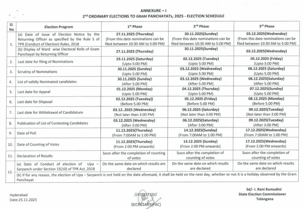 The Telangana Gram Panchayat elections unfold in three staggered phases, a strategic move to manage logistics across the state’s diverse terrain. Phase one fires the starting gun on November 27, 2025, with notifications issued between 10:30 AM and 5:00 PM. Returning officers then display ward-wise electoral rolls on November 29, setting the stage for nominations. Aspiring candidates file papers up to 5:00 PM that day, followed by scrutiny on November 30 until 5:00 PM. Validly nominated contenders emerge by 5:00 PM, with appeals wrapping up by December 1 and disposals by December 2, all before 5:00 PM.