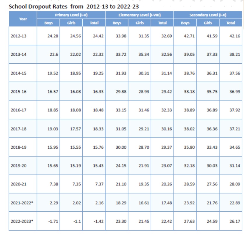 Analyzing the school dropout rates from 2012-2023 shows a fluctuating trend. The rates were significantly high in 2012-13, with 24.28% for boys and 24.56% for girls at the primary level. Over the years, there have been efforts to reduce these rates, with noticeable improvements in 2020-21 and 2021-22. However, the dropout rates saw a concerning rise again in 2022-2023.